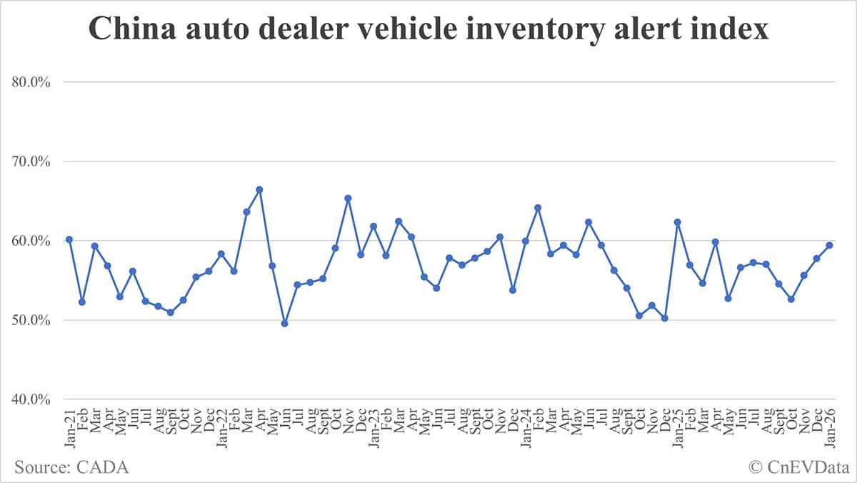 China vehicle inventory alert index rises to 59.4% in Jan