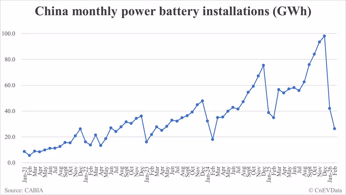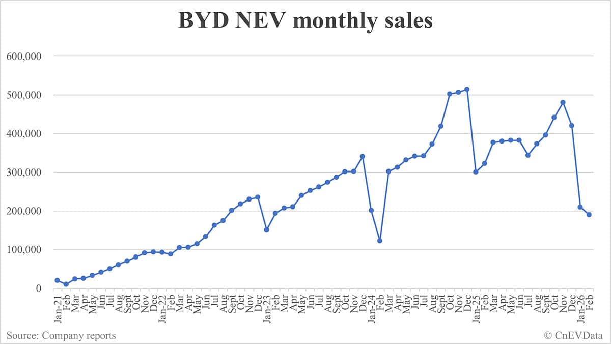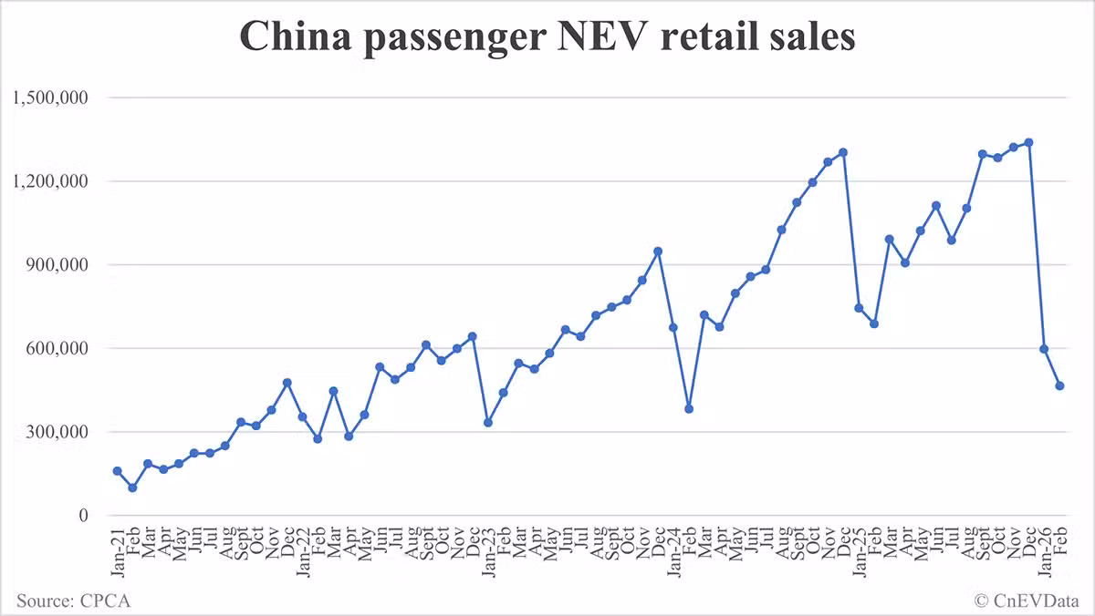 BEV retail sales in February totaled 278,000 units, down 34.9% year-on-year and 20.1% month-on-month.