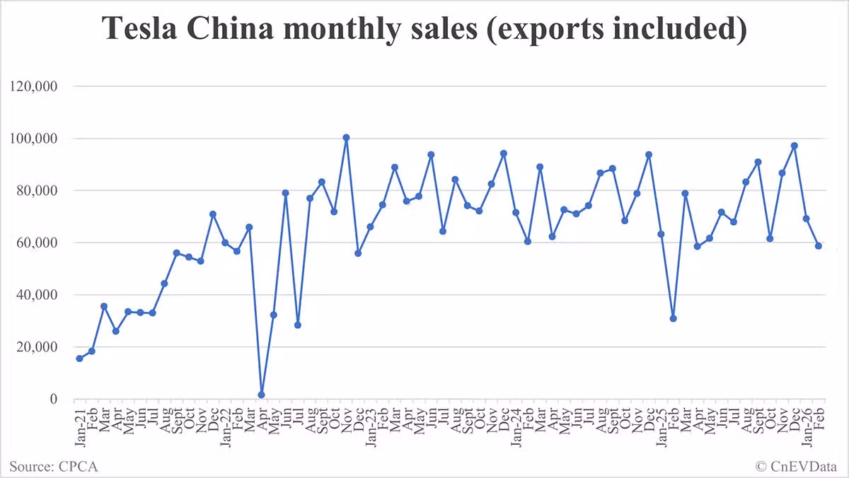 In January-February, Tesla's retail sales in China totaled 56,691 units, marking a 6.26% year-on-year decline.
