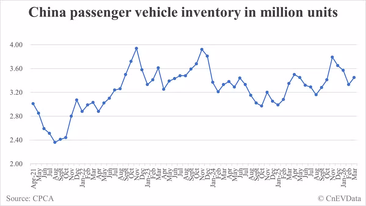 Automakers producing only NEVs had an inventory of 690,000 units at the end of March, up from 680,000 units at the end of February.
