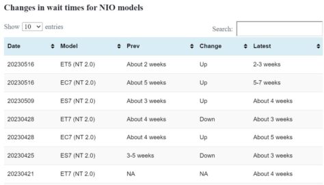 Wait times for the NIO EC7 and ET5 became slightly longer on May 16.