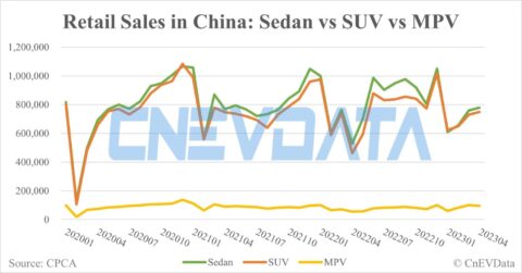 China’s April retail sales were 779,511 for sedans, 748,503 for SUVs and 95,554 for MPVs.