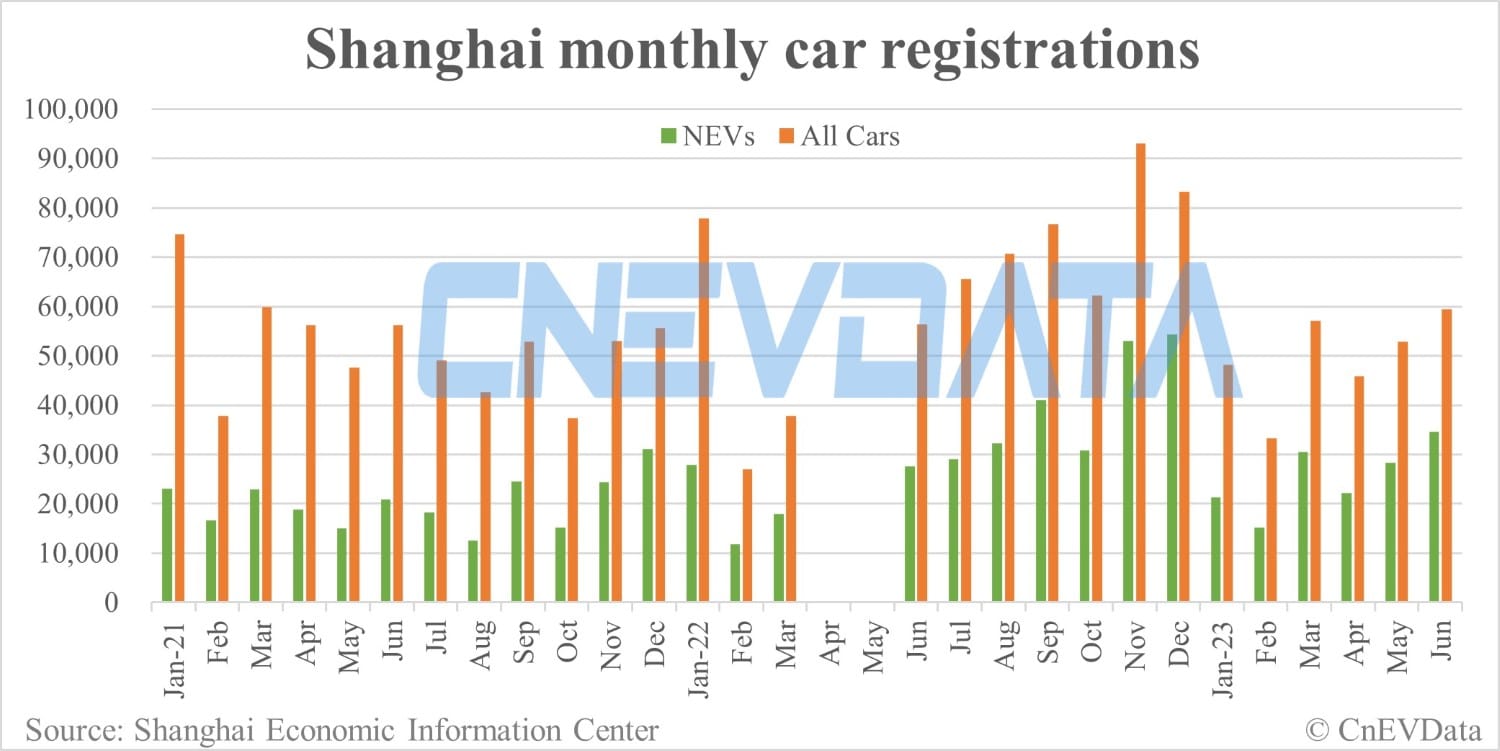 NEVs contributed 58.2 percent of the 59,454 license plate registrations for all vehicles in Shanghai in June.