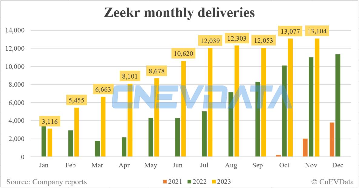 Zeekr’s cumulative deliveries in the January-November period stood at 105,209 vehicles, up 73.60 percent year-on-year.