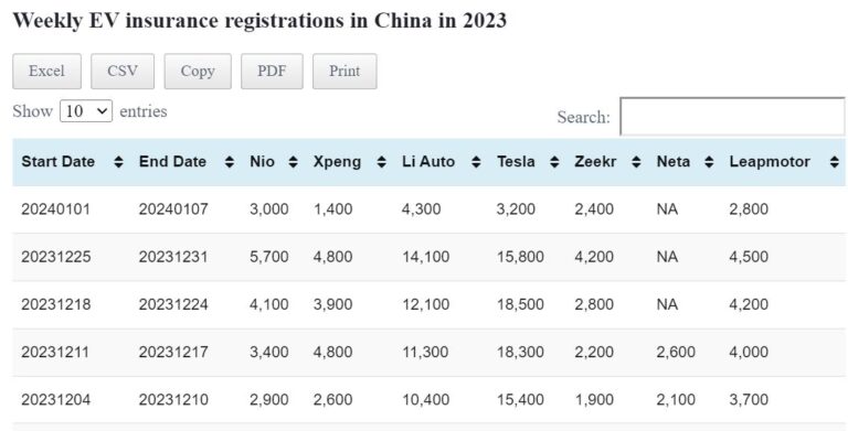 Data table: China EV weekly insurance registrations