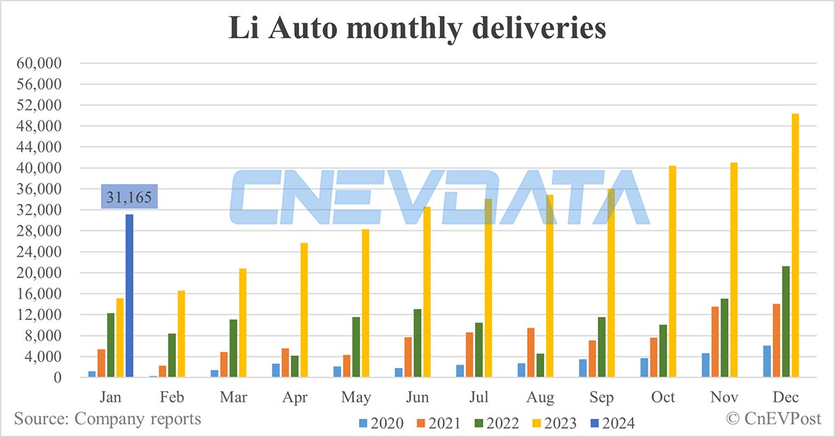 Li Auto deliveries in January were up 105.83 percent year-on-year, but down 38.11 percent from December.
