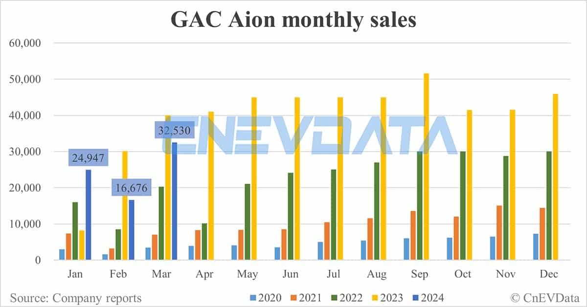 GAC Aion sales in March were down 18.71 percent year-on-year, but up 95.07 percent from February.