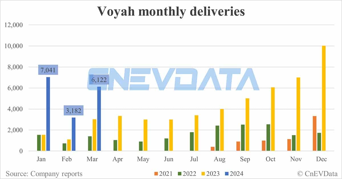 Voyah delivered 6,122 vehicles in March, up 102.25 percent year-on-year and up 92.39 percent compared to February.