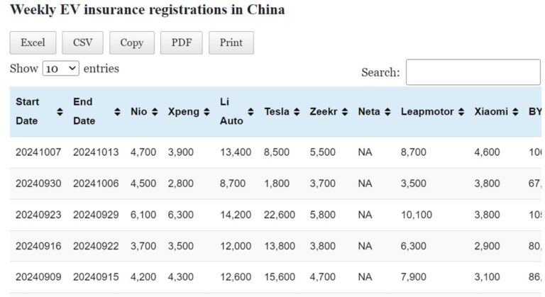 Data table: China EV insurance registrations in Oct 7-13