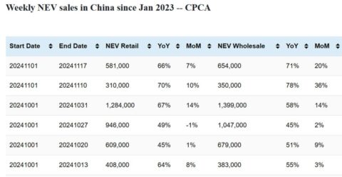 In November 1-17, China’s passenger NEV retail sales amounted to 581,000 units, up 66 percent from a year earlier and up 7 percent from a month earlier.