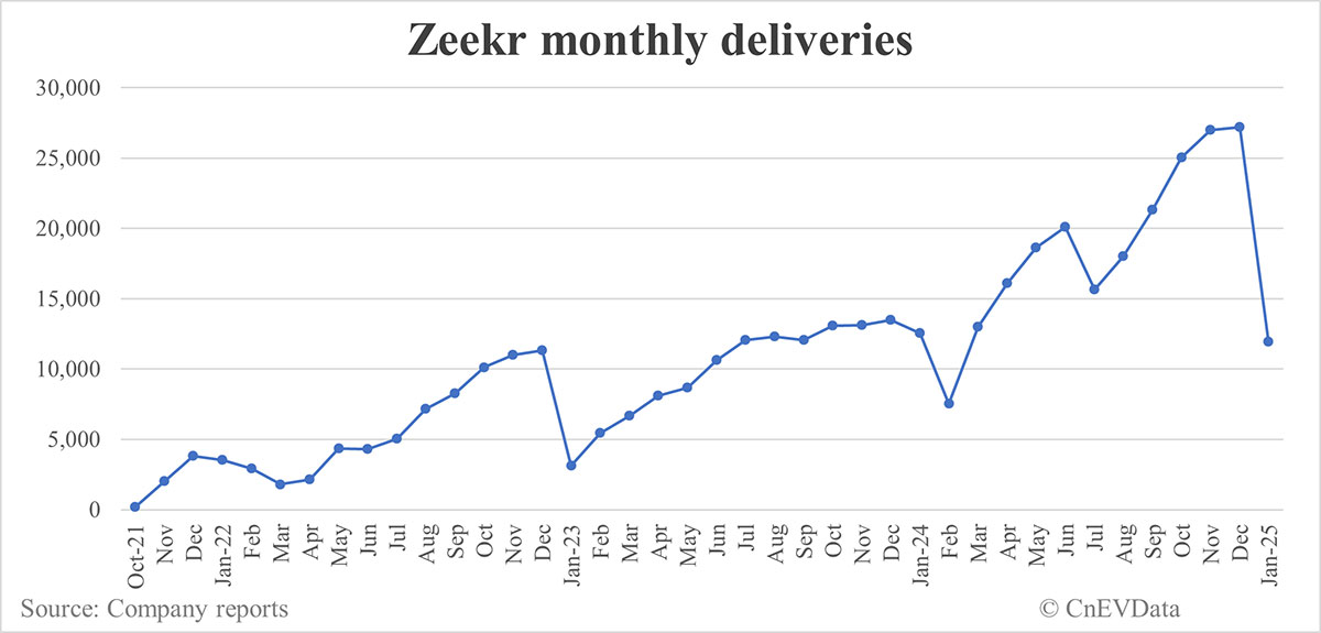 Zeekr delivered 11,942 vehicles in January, down 4.75 percent year-on-year and down 56.08 percent from December.