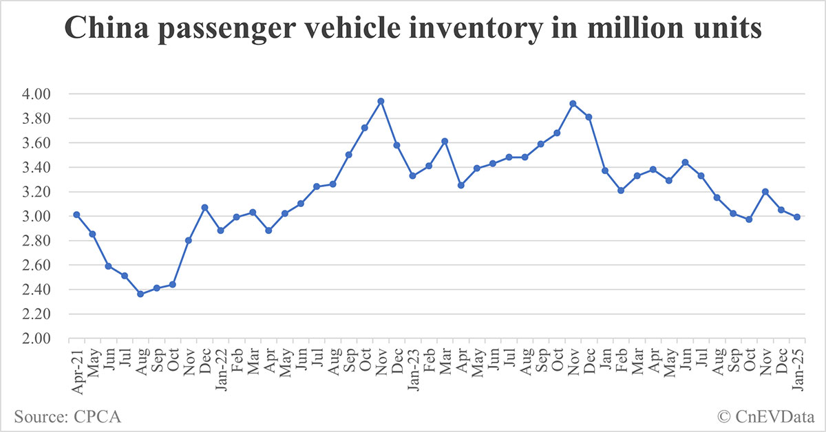 Automakers that produce only NEVs had inventories of 670,000 units at the end of January, up from 660,000 units at the end of December.