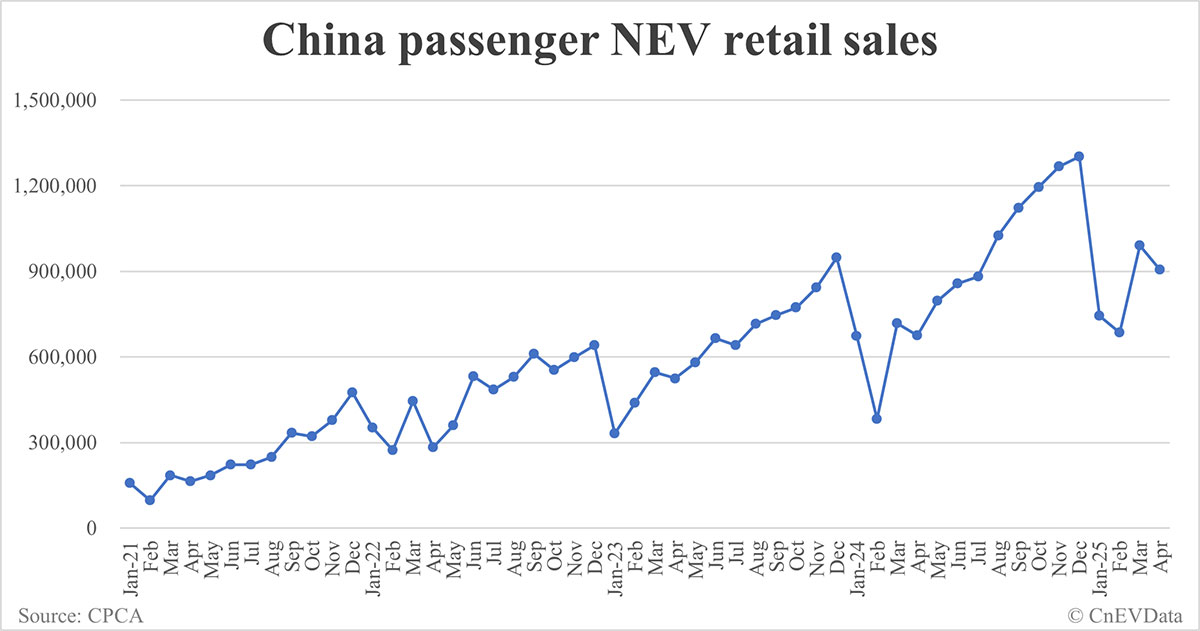 Retail sales of BEVs in April were 559,000 units, up 38 percent year-on-year, but down 13.5 percent from March.