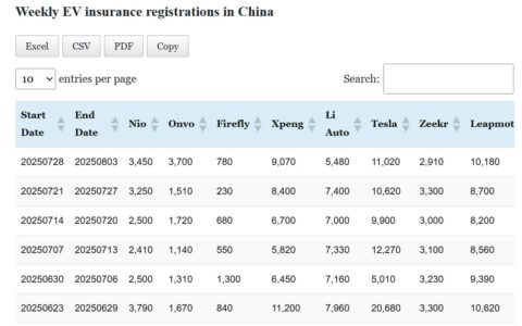 Data table: China EV insurance registrations in Jul 28-Aug 3