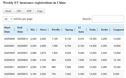 Data table: China EV insurance registrations in Sept 8-14