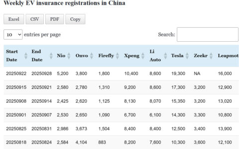 Data table: China EV insurance registrations in Sept 29-Oct 5
