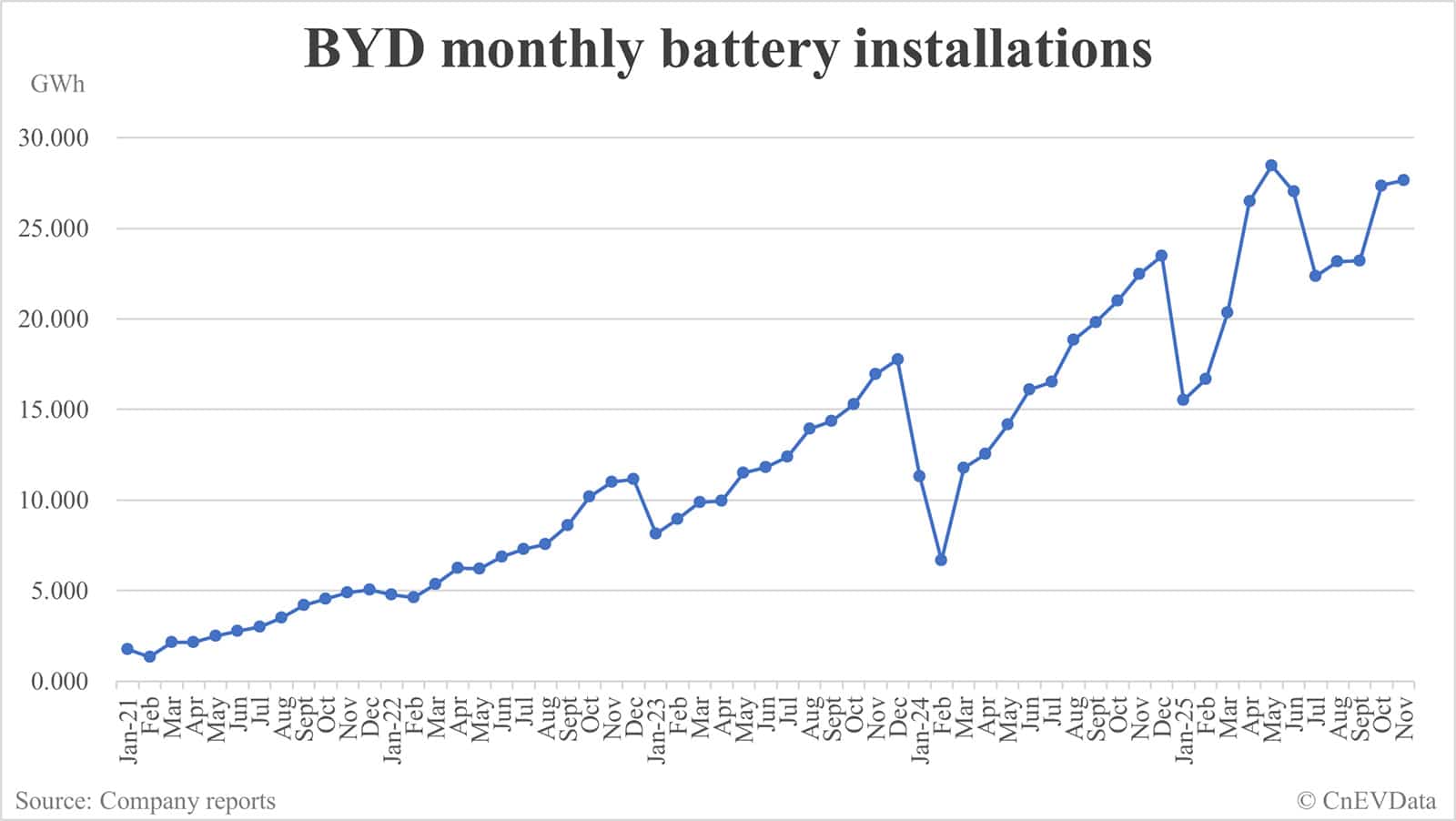 From January to November, BYD’s power battery and energy storage battery installations totaled about 258.282 GWh, representing a year-on-year increase of 50.86 percent.