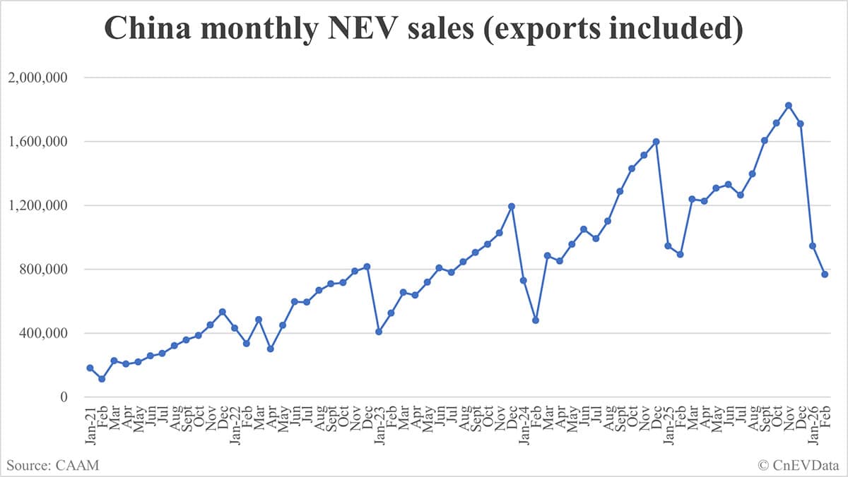 China Feb NEV sales data by CAAM: 765,000-CnEVData