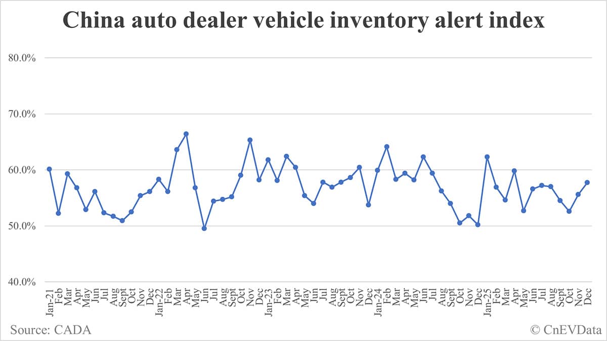 China vehicle inventory alert index rises to 57.7% in Dec