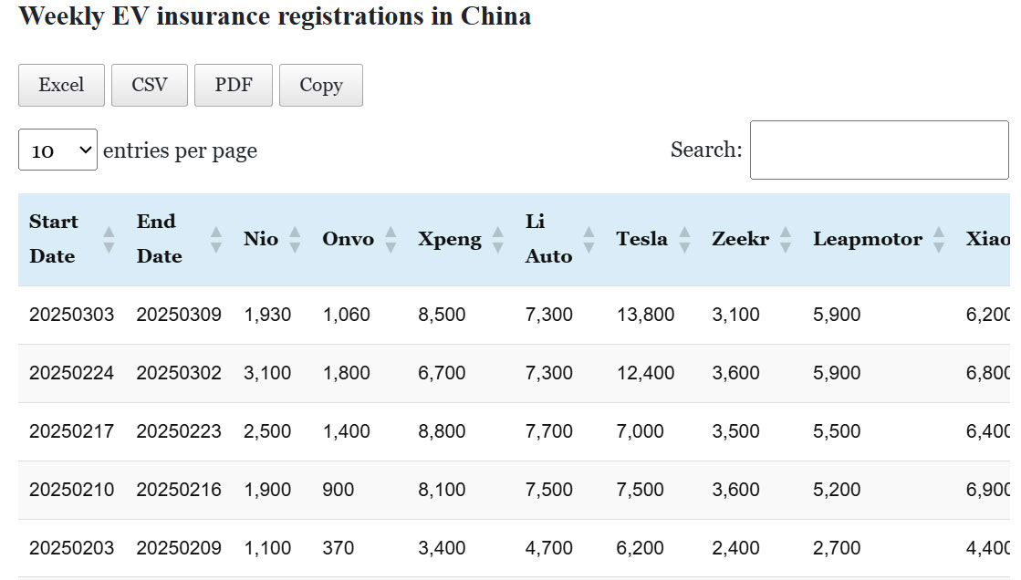 Data table: China EV insurance registrations in Feb 24-Mar 2
