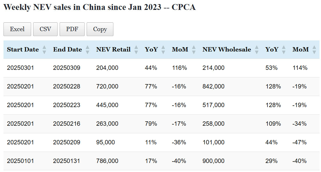 Retail sales of passenger NEVs in China from March 1-9 totaled 204,000 units, up 44 percent from a year ago and up 116 percent from a month ago.