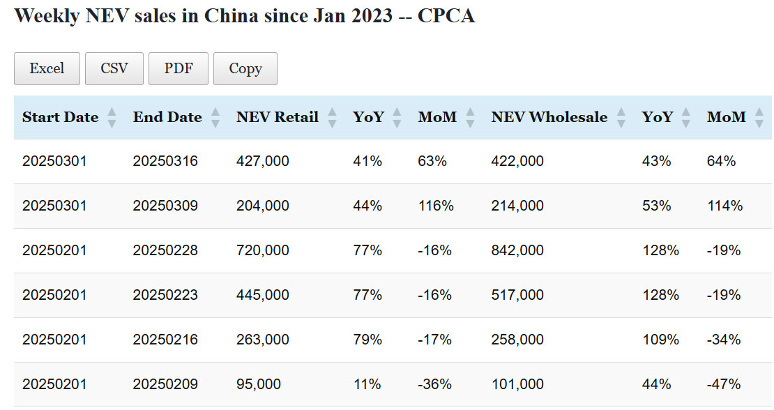 Retail sales of passenger NEVs in China from March 1-16 were 427,000 units, up 41 percent from a year earlier and up 63 percent from a month earlier.