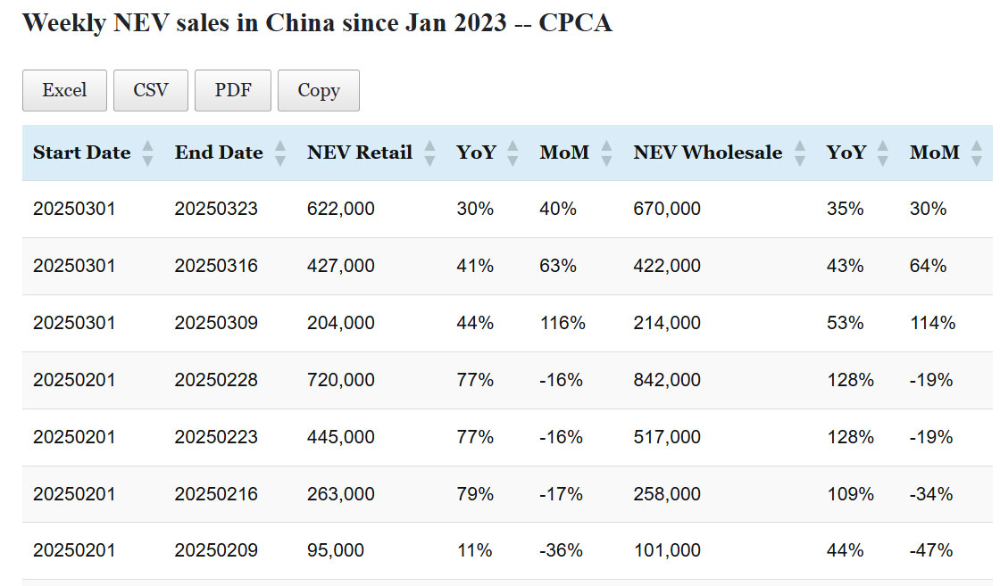 From March 1-23, retail sales of passenger NEVs in China totaled 622,000 units, an increase of 30 percent year-on-year and up 40 percent month-on-month.