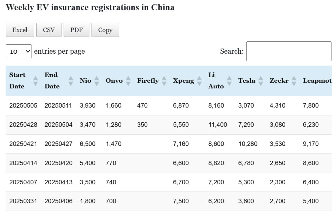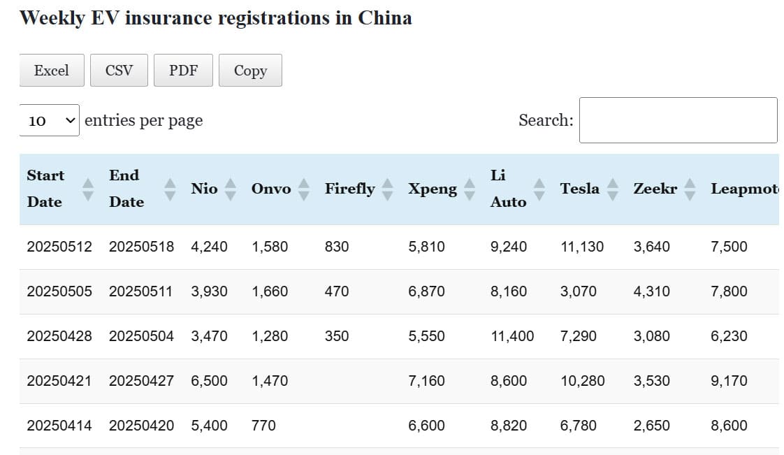 Data table: China EV insurance registrations in May 5-11