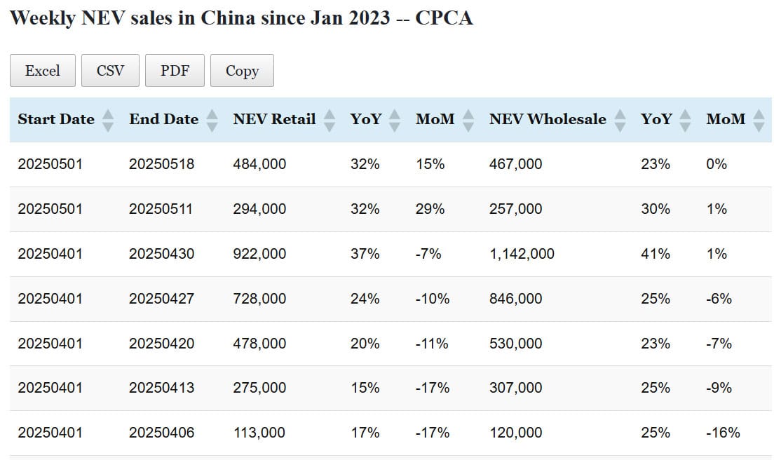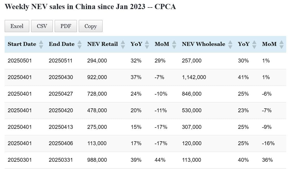 Data table: China NEV sales in May 1-25