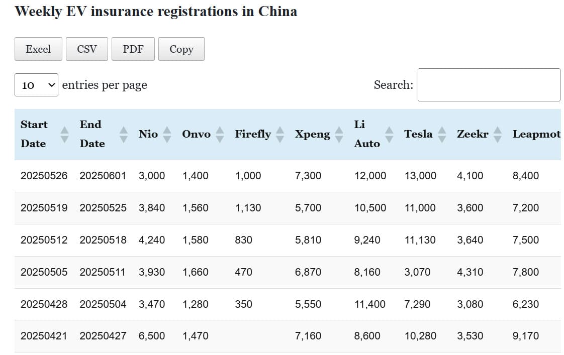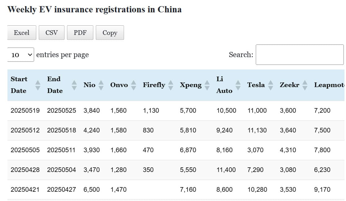 Data table: China EV insurance registrations in May 19-25