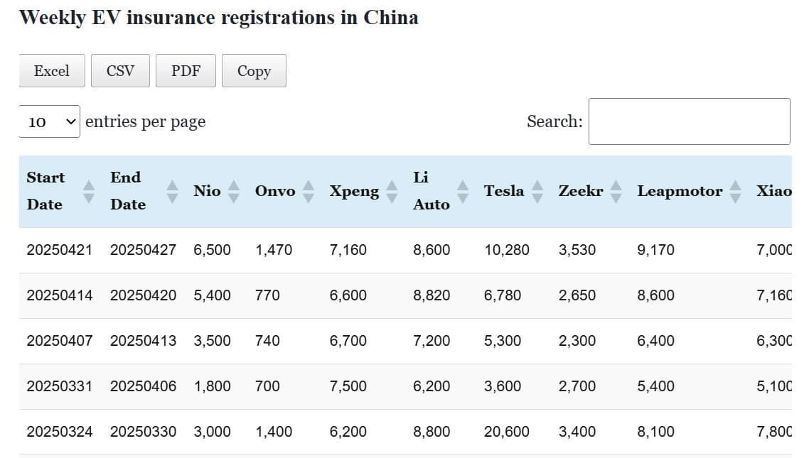 Weekly insurance registrations for vehicles of Nio, Xpeng, Li Auto, Tesla, Zeekr, and Leapmotor are included in this article.