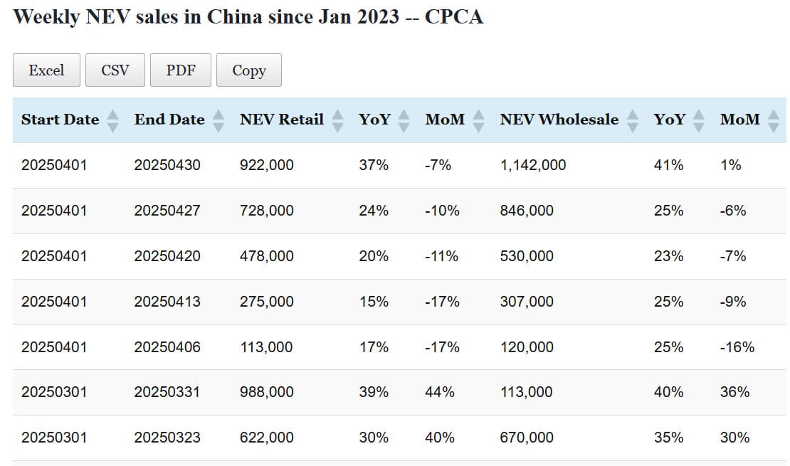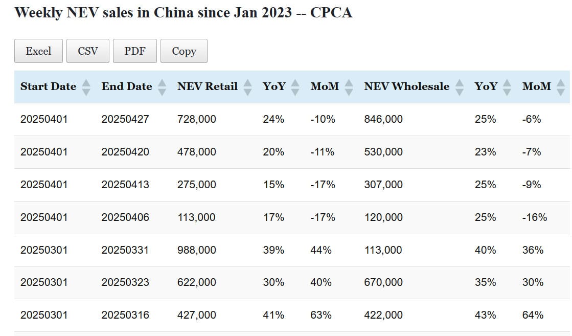 Data table: China NEV sales in Apr 1-27