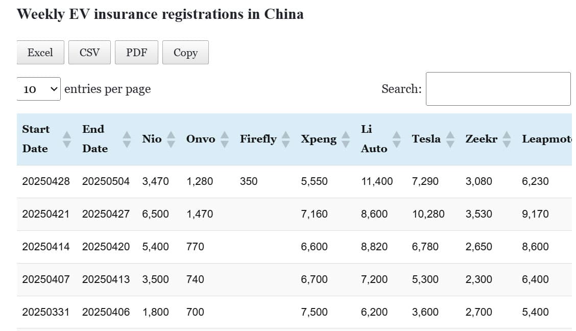 Data table: China EV insurance registrations in Apr 28-May 4