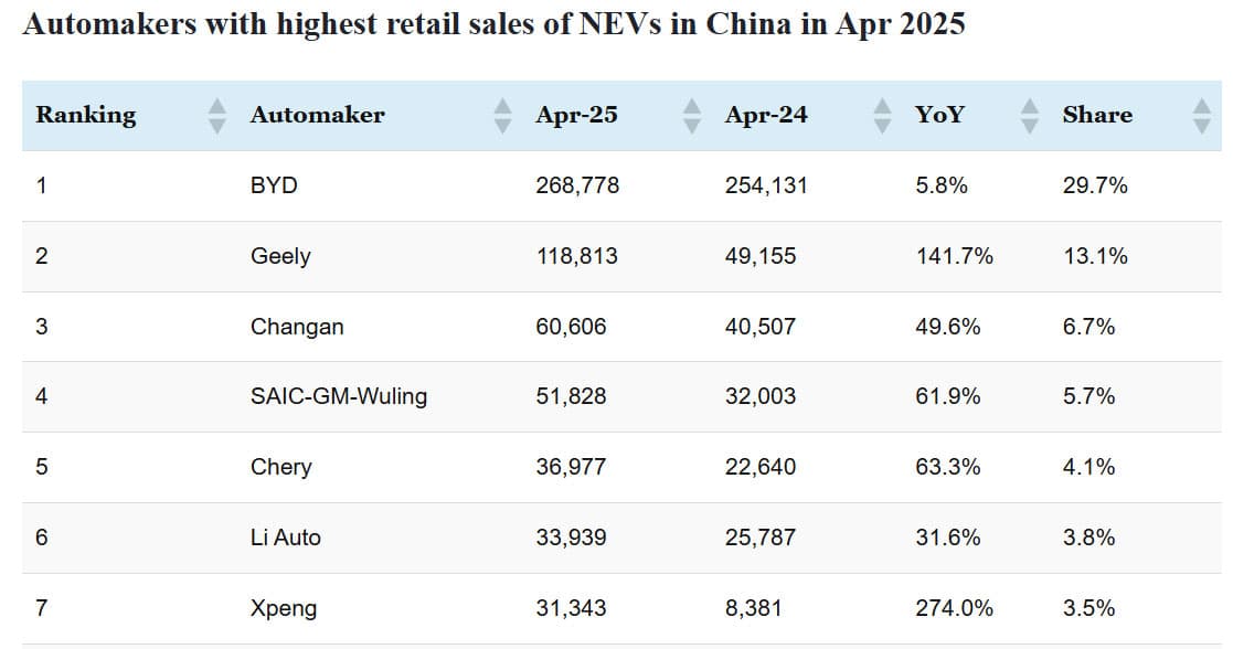 CPCA rankings: Top-selling automakers in China in Apr 2025
