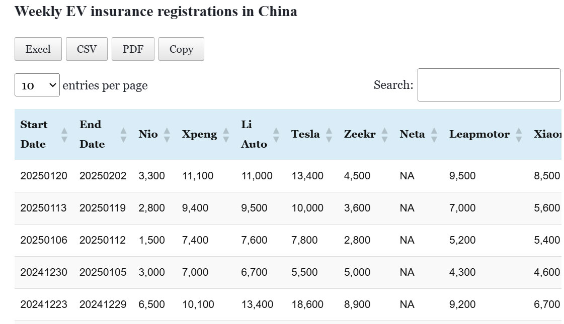 Weekly insurance registrations for vehicles of Nio, Xpeng, Li Auto, Tesla, Zeekr, and Leapmotor are included in this article.