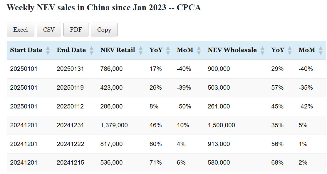China's passenger NEV retail sales in January 1-31 were 17 percent higher than in the same period in 2024, but 40 percent lower than in December.
