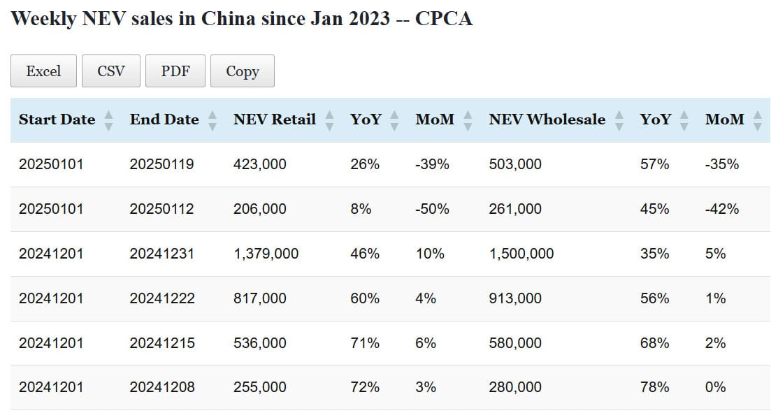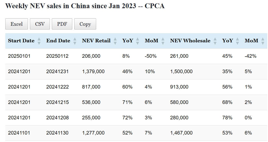 Data table: China NEV sales in Jan 1-12