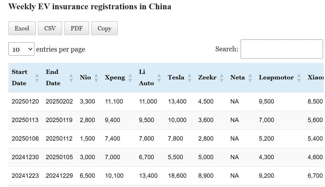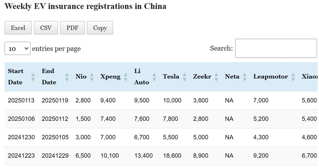 Data table: China EV insurance registrations in Jan 13-19