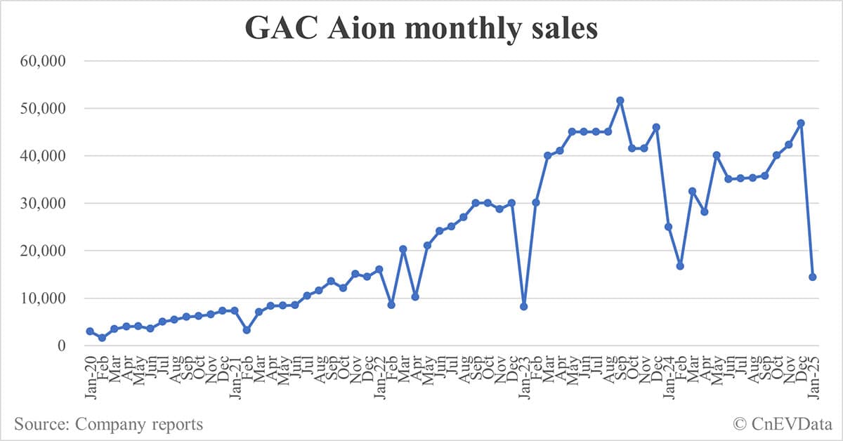 GAC Aion sold 14,393 units in January, down 42.31 percent year-on-year and down 69.28 percent from December.