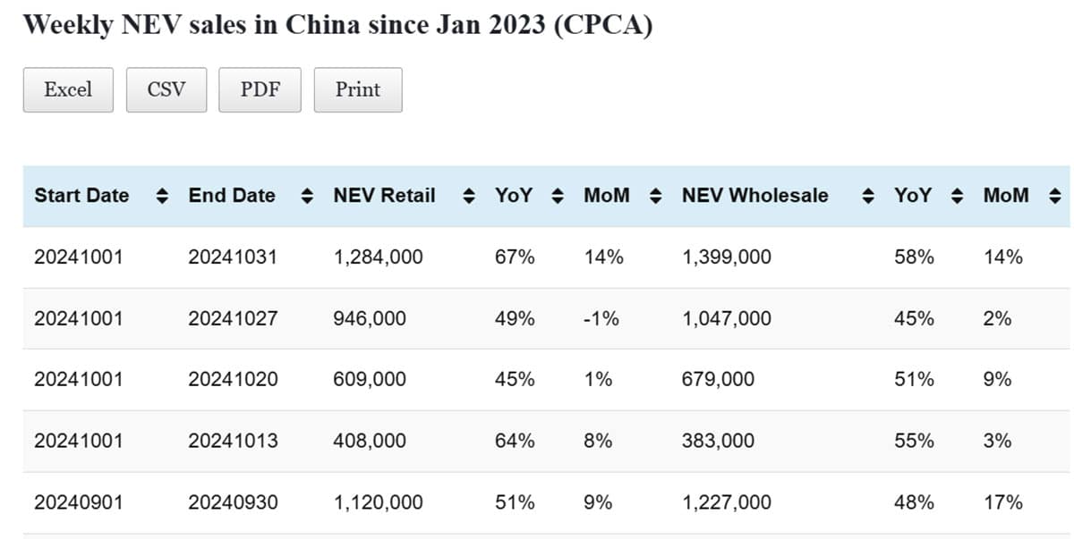Retail sales of passenger NEVs in China totaled 1.284 million units in October 1-31, up 67 percent from a year earlier and up 14 percent from September.