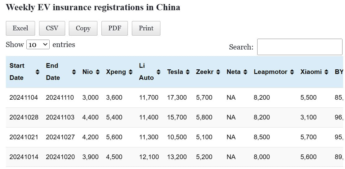 Weekly insurance registrations for vehicles of Nio, Xpeng, Li Auto, Tesla, Zeekr, Neta, and Leapmotor are included in this article.