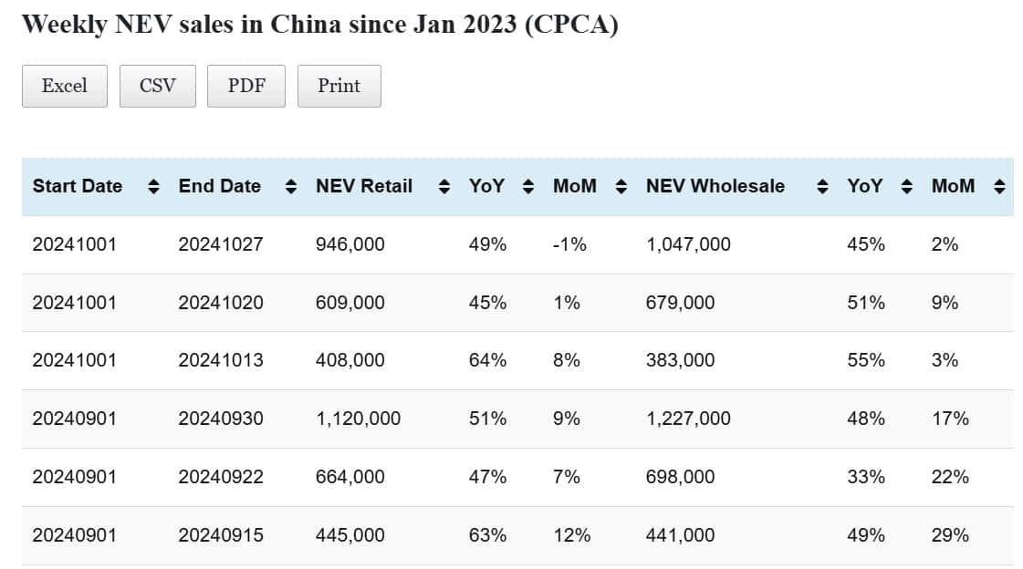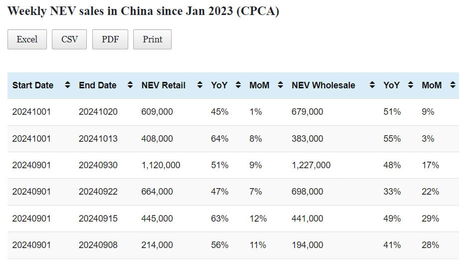 Data table: China NEV sales in Oct 1-27