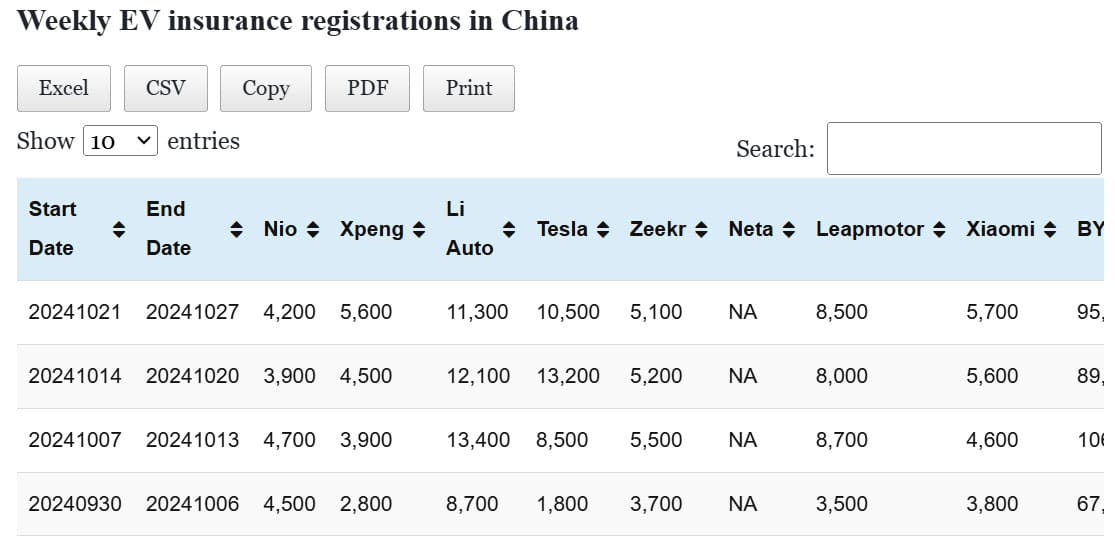 Data table: China EV insurance registrations in Oct 21-27
