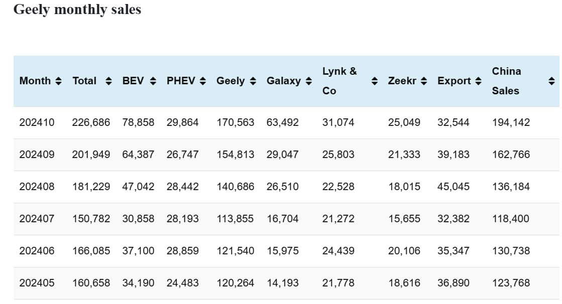 Geely sales in Oct: 226,686