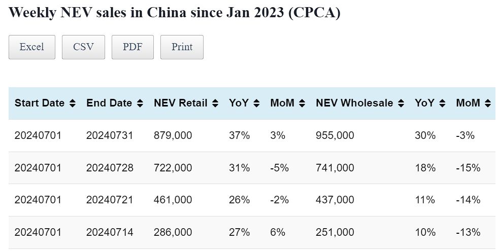 China's BEV sales in July were 551,000 units, up 2.6 percent year-on-year but down 10 percent from June.