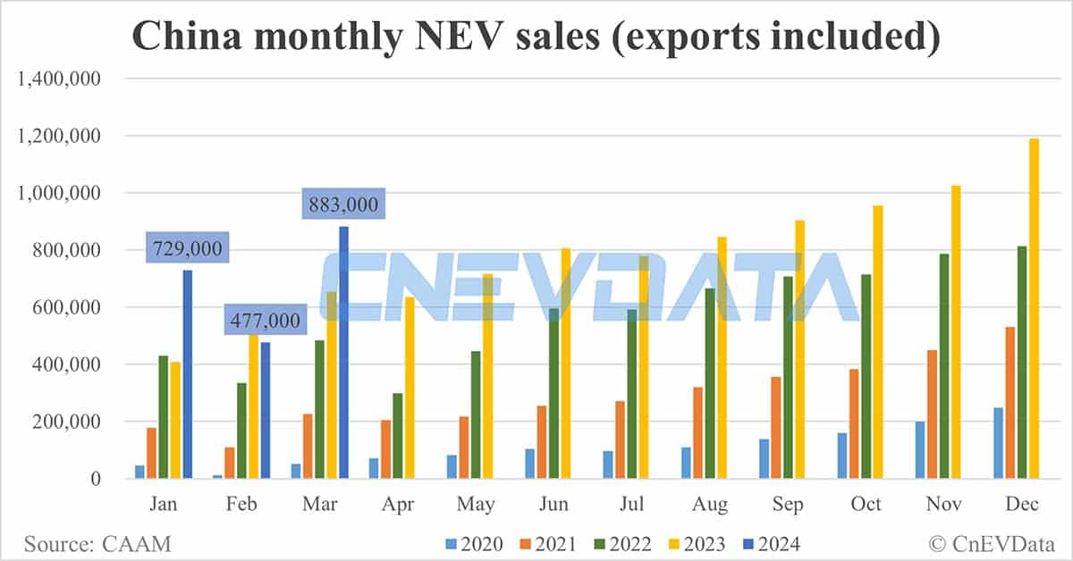 China's BEV sales in March totaled 566,000 units, up 15.5 percent year-on-year and up 92.52 percent from February.