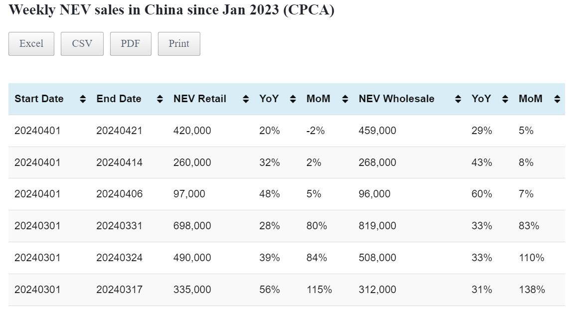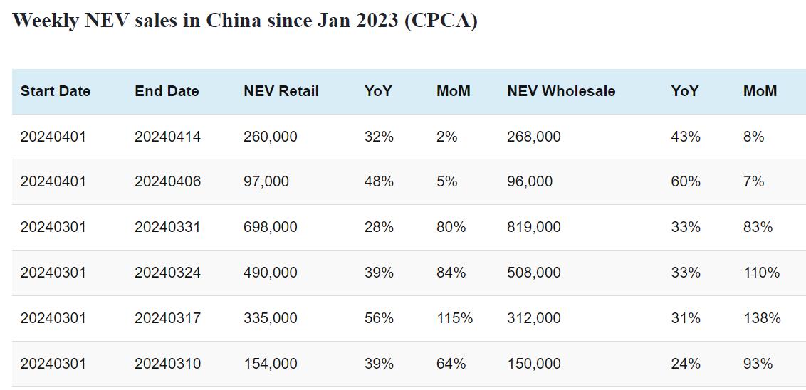 Data table: China NEV sales in Apr 1-14