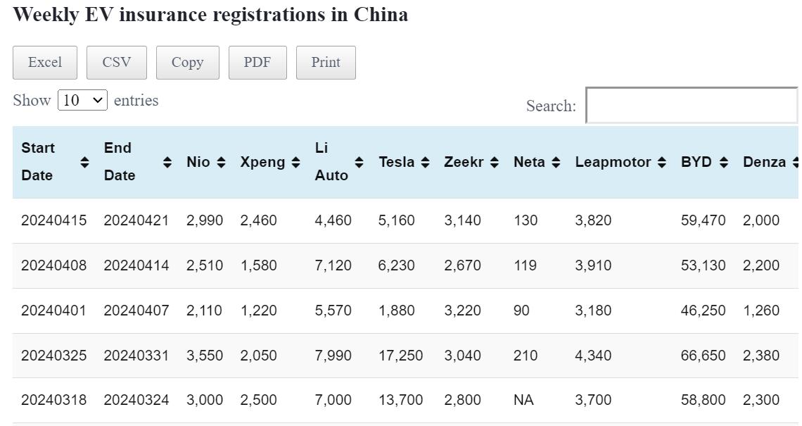 Data table: China EV insurance registrations in Apr 15-21