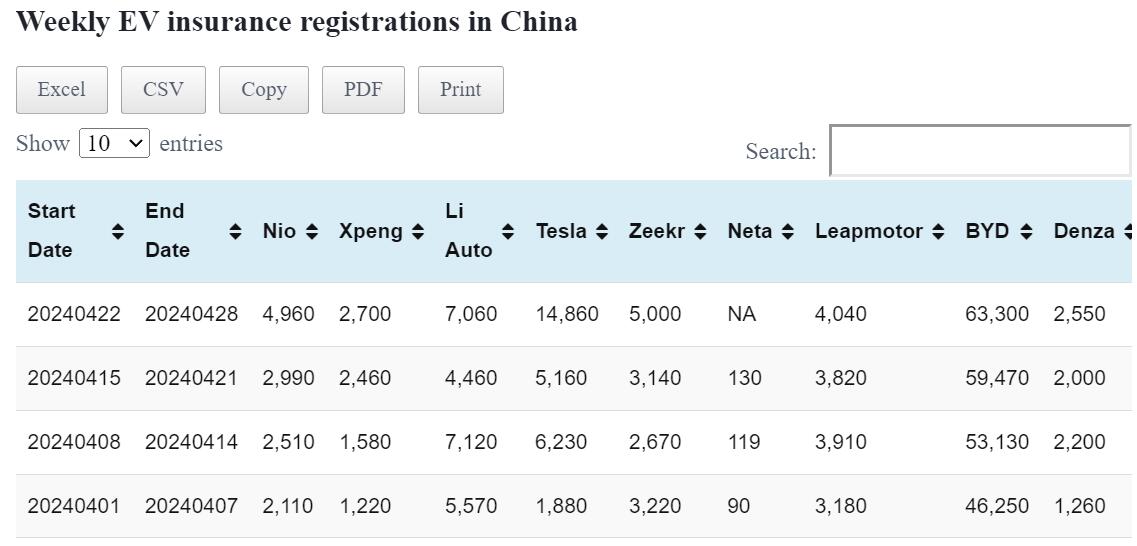 Data table: China EV insurance registrations in Apr 22-28