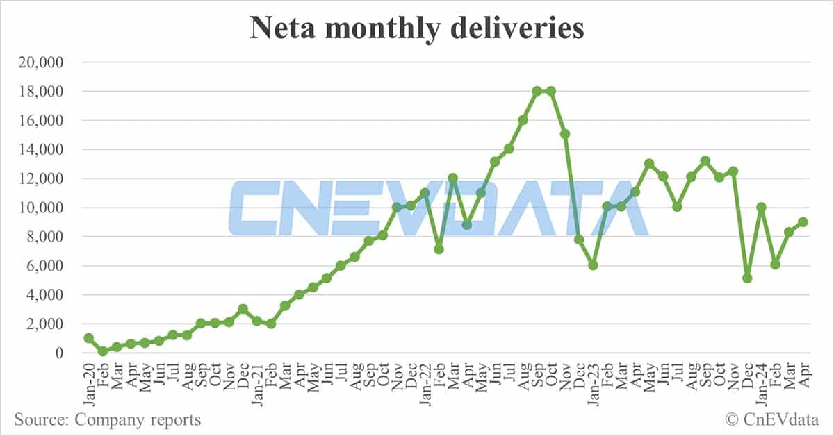 Neta's deliveries in April were down 18.62 percent year-on-year, but up 8.42 percent from March.